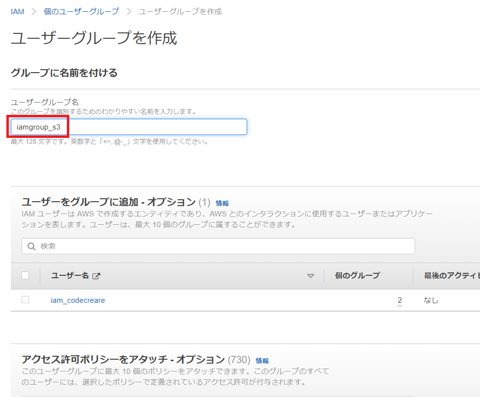 ”グループに名前を付ける”について、今回は、iamgroup_s3 を作成。