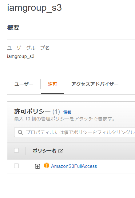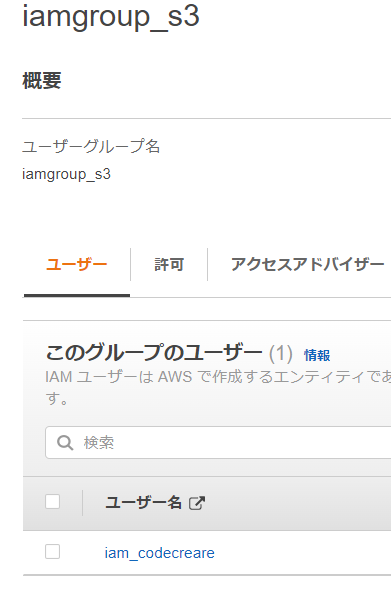 作成完了してユーザグループ(iamgroup_s3)を確認すると、