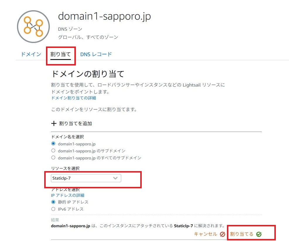 割り当てタブから、リソースを選択し、さきほど作成した静的IPを指定し、割り当てる。