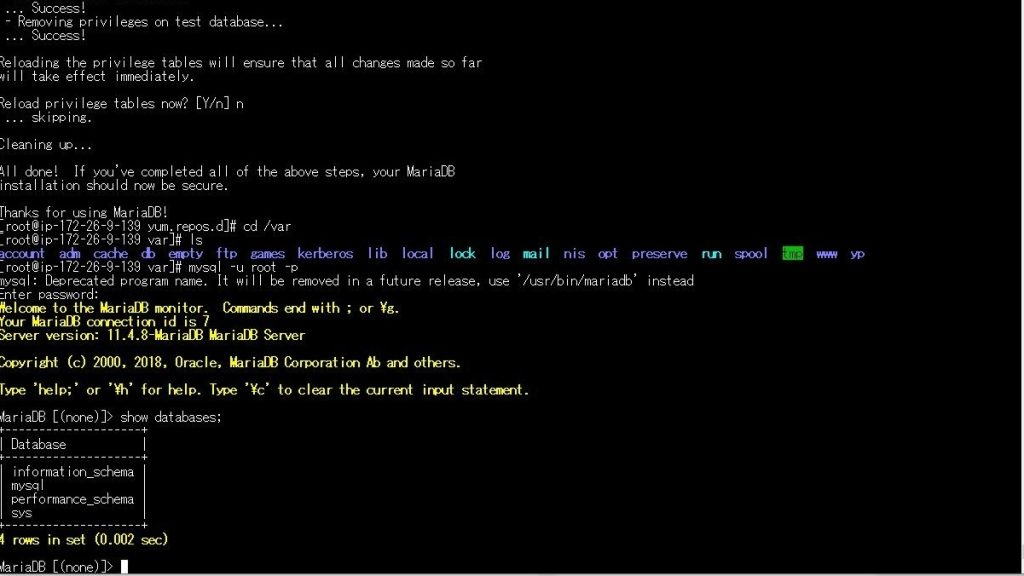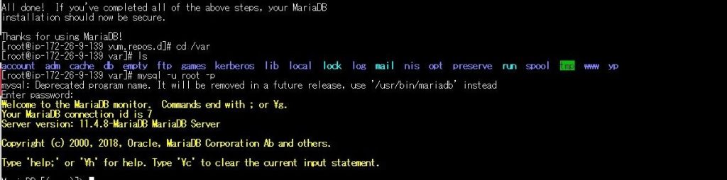 パスワード入力が必要となる。 MariaDB のコマンド入力画面に遷移する事を確認。