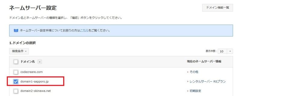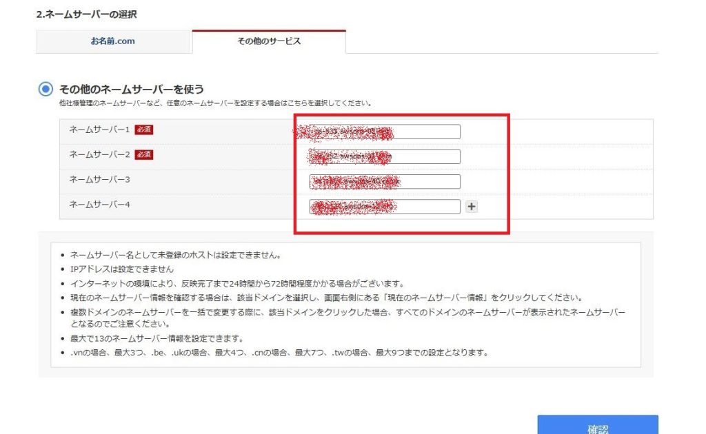 domain1-sapporo.jp にチェックを入れてその他サービスタブを選択し、ネームサーバー情報4つを入力。 最初3つした入力欄が無いが、+ボタンで4つ目を追加。