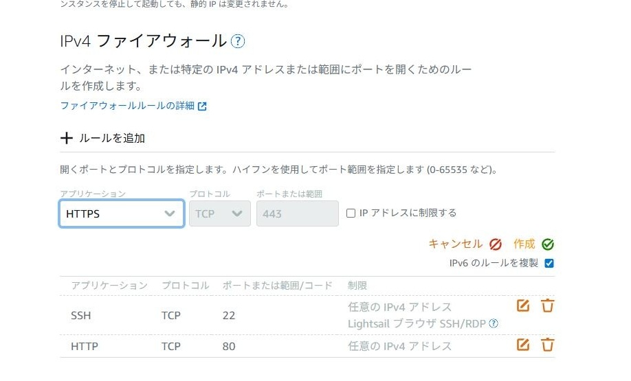LightSailコンソールから、作成したインスタンス → ネットワーキングタブ → ルールの追加 → → HTTPS → 作成