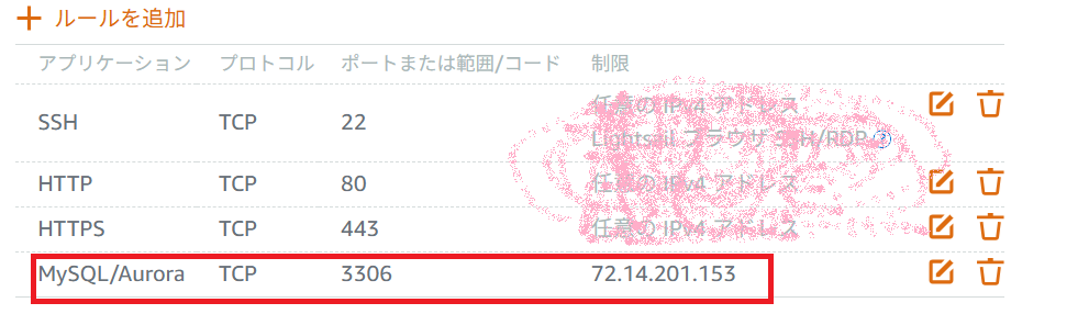 確認したIPに限定して、LightSailのポート開放。 全部開放するのはセキュリティ上よくない。