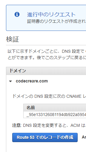 2つのドメインそれぞれに対して、Route53でのレコードの作成を押下。