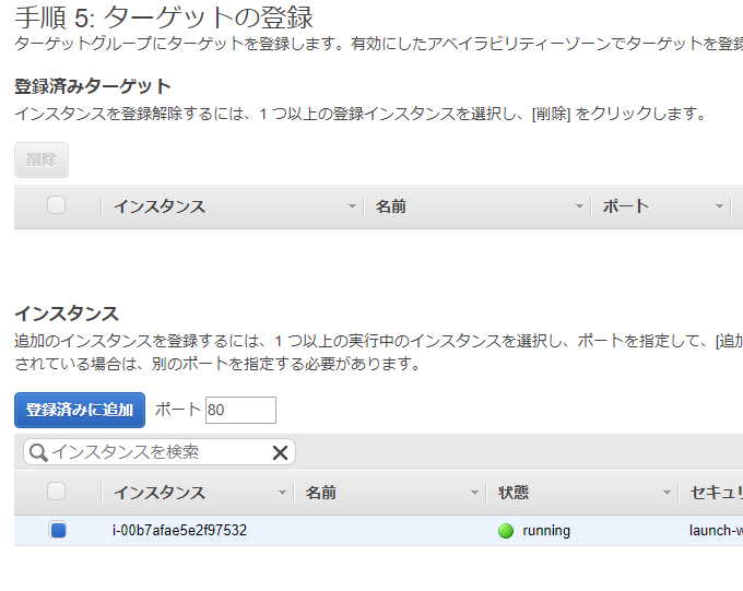 ロードバランサのセキュリティグループを、EC2作成時に生成されたものを選択、次の手順へ